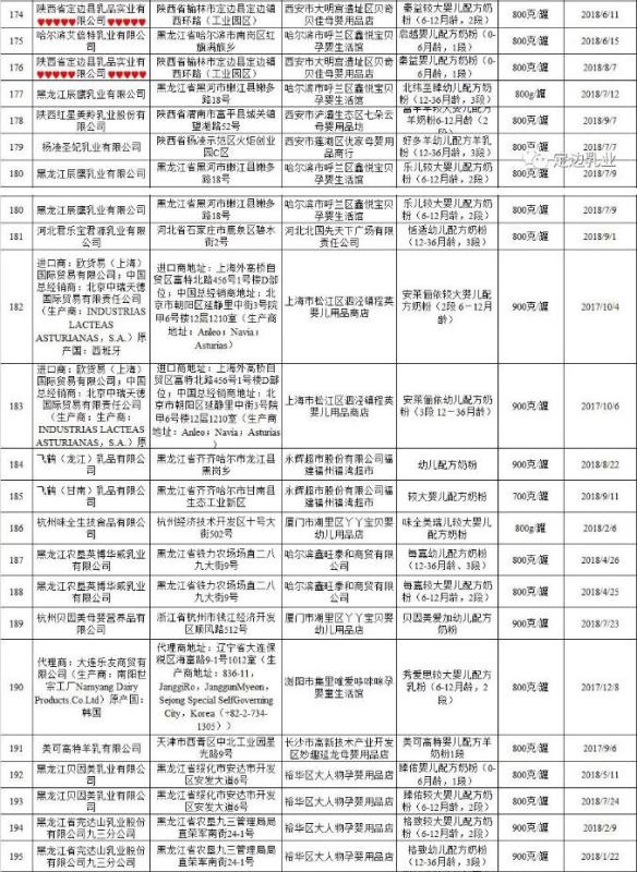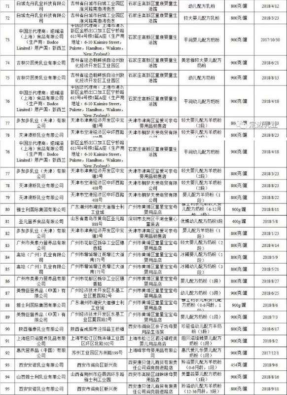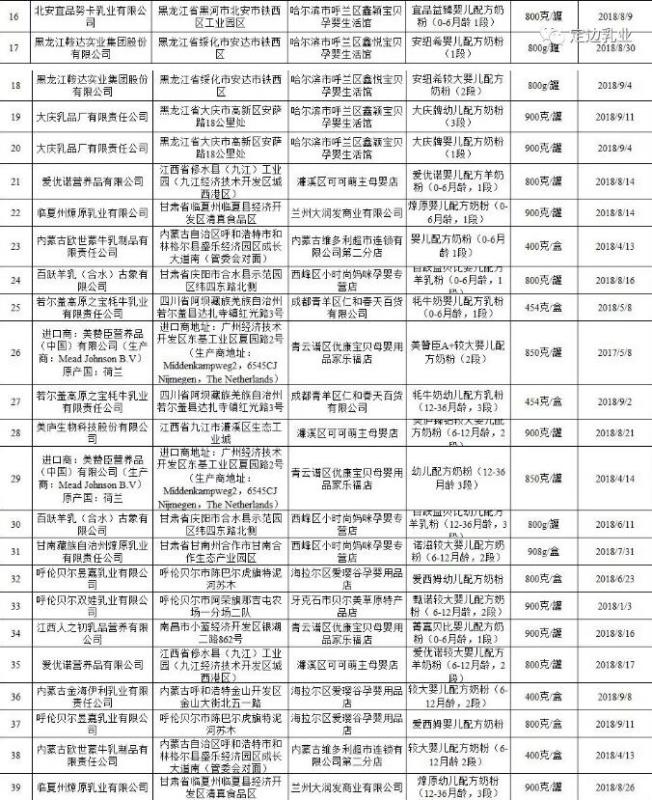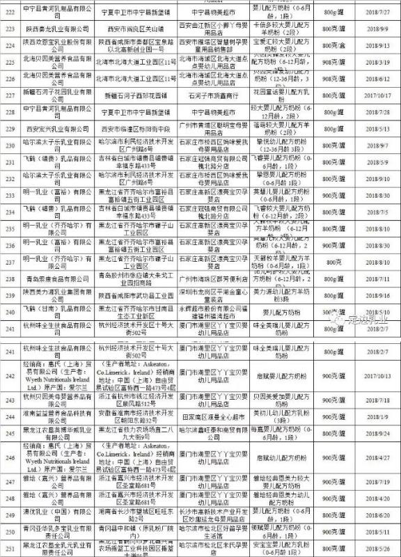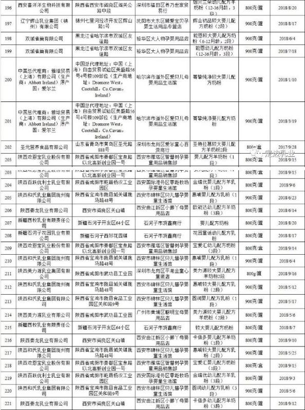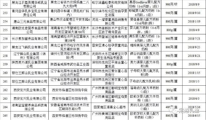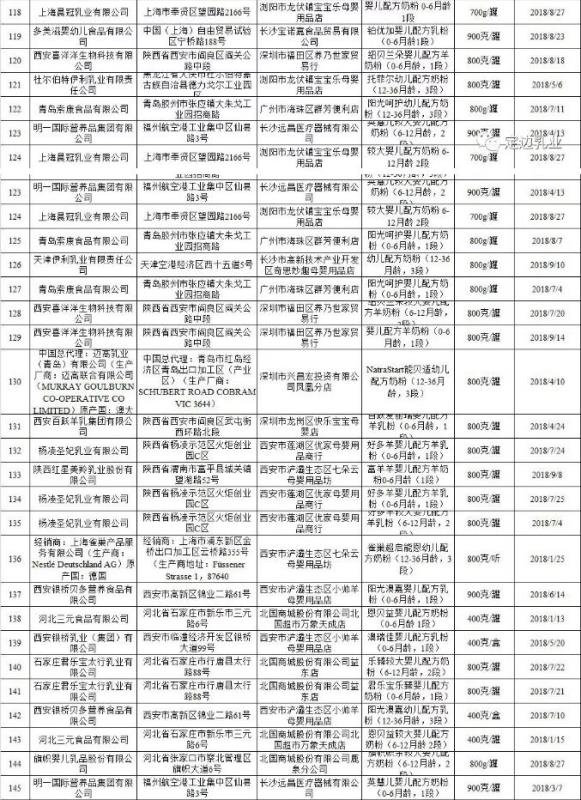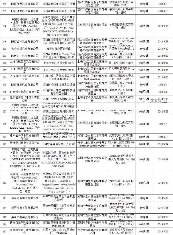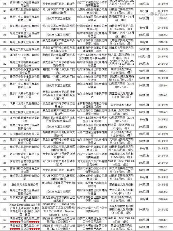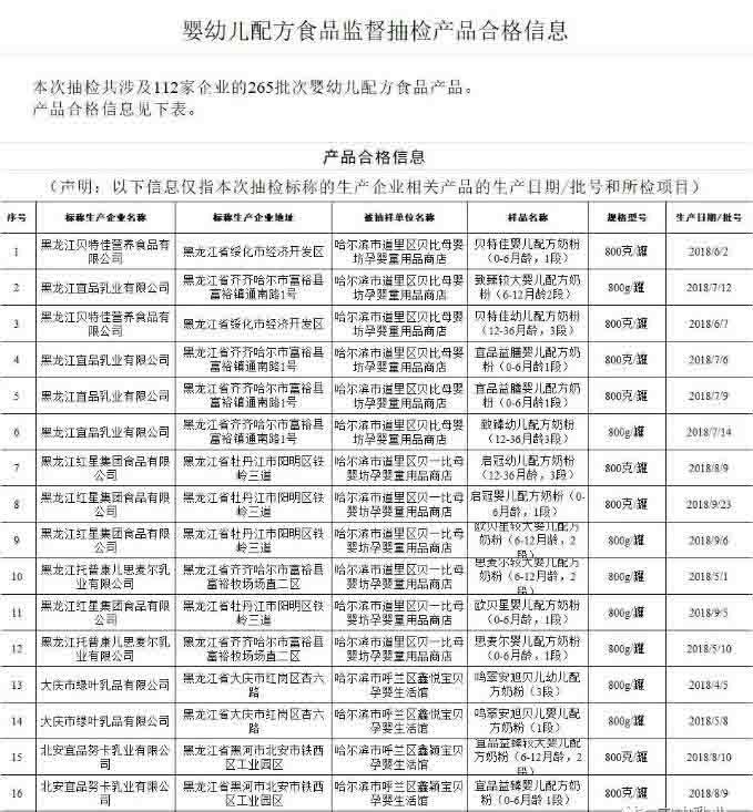 2018年11月27日,國(guó)家市場(chǎng)監(jiān)督管理總局發(fā)布抽檢信息顯示,被抽檢的112家企業(yè)265個(gè)批次嬰幼兒配方食品產(chǎn)品全部合格。抽檢產(chǎn)品包括:定邊、紅星、愛(ài)優(yōu)諾、百躍、美贊臣、雙娃、完達(dá)山、貝因美、雅士利、圣元、高培、惠氏、伊利、多美滋、晨冠、明一、銀橋、三元、旗幟、飛鶴、味全、輝山、雀巢、太子樂(lè)、雅培、澳優(yōu)、等112家,265個(gè)批次嬰幼兒配方食品!