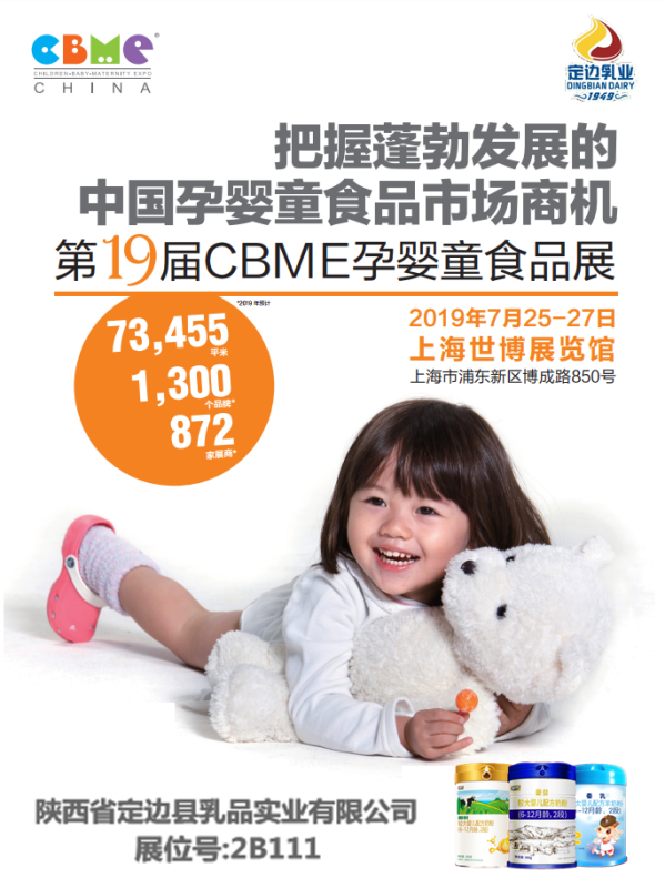 2019年7月25日至27日,定邊乳業(yè)將攜旗下三個品牌,秦益(愛貝聰牛奶粉)、秦悅(愛貝優(yōu)牛奶粉)、秦乳(純羊奶粉)盛裝參加,將在上海世博展覽館舉行的,第19屆CBME孕嬰童食品展。展位號:2B111