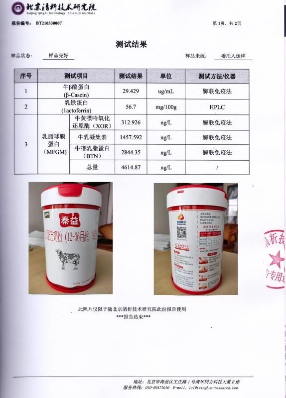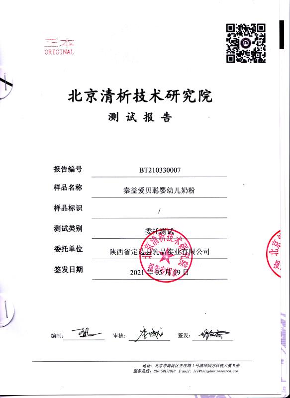 秦益愛貝聰奶粉,經(jīng)北京清析技術(shù)研究院權(quán)威檢測認(rèn)證結(jié)果如下圖: