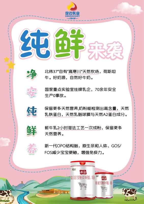 定邊乳業(yè)一直以中國寶寶健康成長為己任,秉承科學(xué)嚴(yán)謹(jǐn)?shù)奶剿鲗嵺`,既聚勢謀遠、又腳踏實地。正如定邊乳業(yè)董事長馬世平的那句座右銘“乳品行業(yè)是良心行業(yè)、道德行業(yè)、要做一個有社會責(zé)任心的企業(yè)”。定邊乳業(yè)一直秉承良心企業(yè)這一宗旨,確保每一款、每一個產(chǎn)品出廠都是100%合格。讓寶寶更健康!讓媽媽更安心!是我們一直不變的最求。